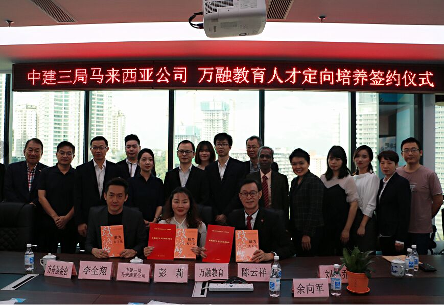 4月2日,中建三局马来西亚公司与万融教育举行免学费留学人才定向培养签约仪式。签约仪式在中建三局马来西亚公司会议室举行。中建三局马来西亚公司副总经理彭莉、胡涛、蒋向阳、余向军、朱远辉,万融教育总裁陈云祥,马来西亚方舟基金会主席拿督斯里李全翔,学生代表以及中央电视台马来西亚站记者、星洲日报记者参加签约仪式。