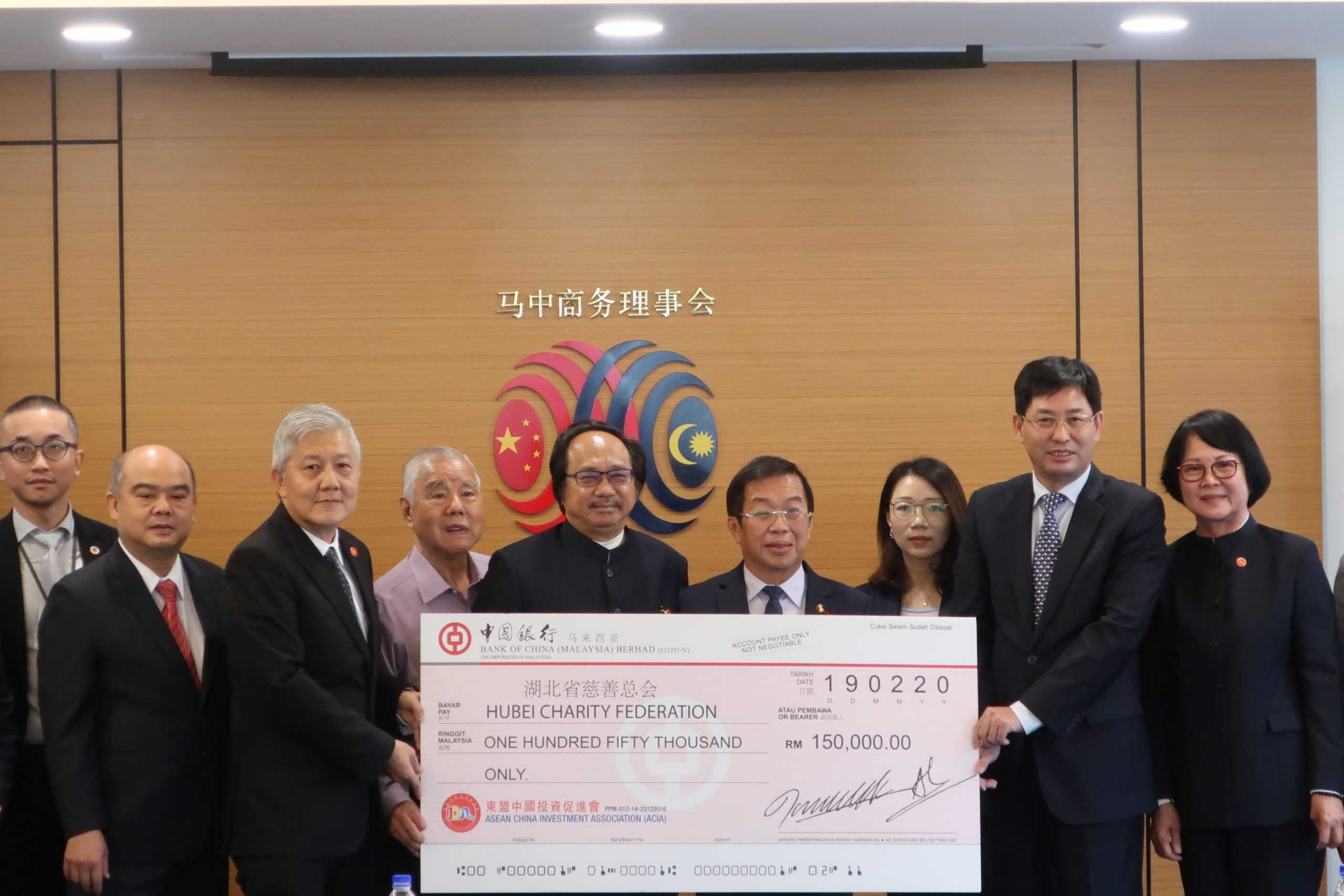 2月19日,东盟-中国投资促进会筹集了马币15万令吉的善款,经由马来西亚首相对华特使陈国伟、中国驻马来西亚大使馆代表的见证,将通过马来西亚中资企业总商会捐赠至湖北慈善总会。