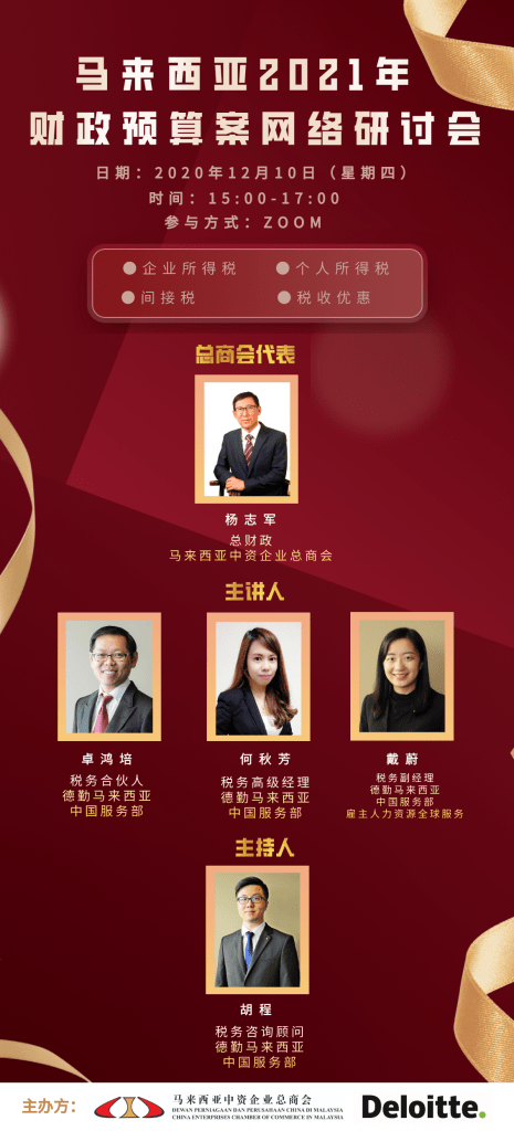 2020年12月10日,马来西亚中资企业总商会与德勤马来西亚中国服务部联合举办了马来西亚2021年财政预算案网络研讨会。