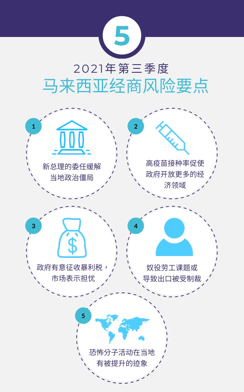 总结,马来西亚的政治环境趋向稳定,新政府依然高度关注抗疫和经济复苏的工作,但重大的基建投资项目预计会缺乏官方的推动,直到下一个全国大选。在奴役劳工的课题上,马来西亚的企业逐渐面临来自国际的压力,这构成了营运中断和出口受到制裁的风险。最后,本土的恐怖分子活动有被提升的迹象,外资企业有必要关注国家安全的课题以提高营运防范措施。