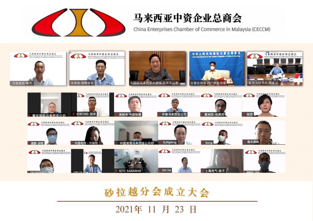 On 23rd Nov 2021 China Enterprises Chamber of Commerce in Malaysia (CECCM) launched the CECCM Sarawak Working Committee successfully. The virtual launching ceremony was hosted by Secretary-General of CECCM, Zhou Jiayi. Honourable guests included Minister Counselor of the Embassy of the People’s Republic of China in Malaysia, Zhang Peidong, Consul General of the Consulate General of the People’s Republic of China in Kuching, Cheng Guangzhong, President of CECCM, Zhang Min and the newly appointed President of CECM Sarawak Working Committee, Chai Jie, and members of CECCM.