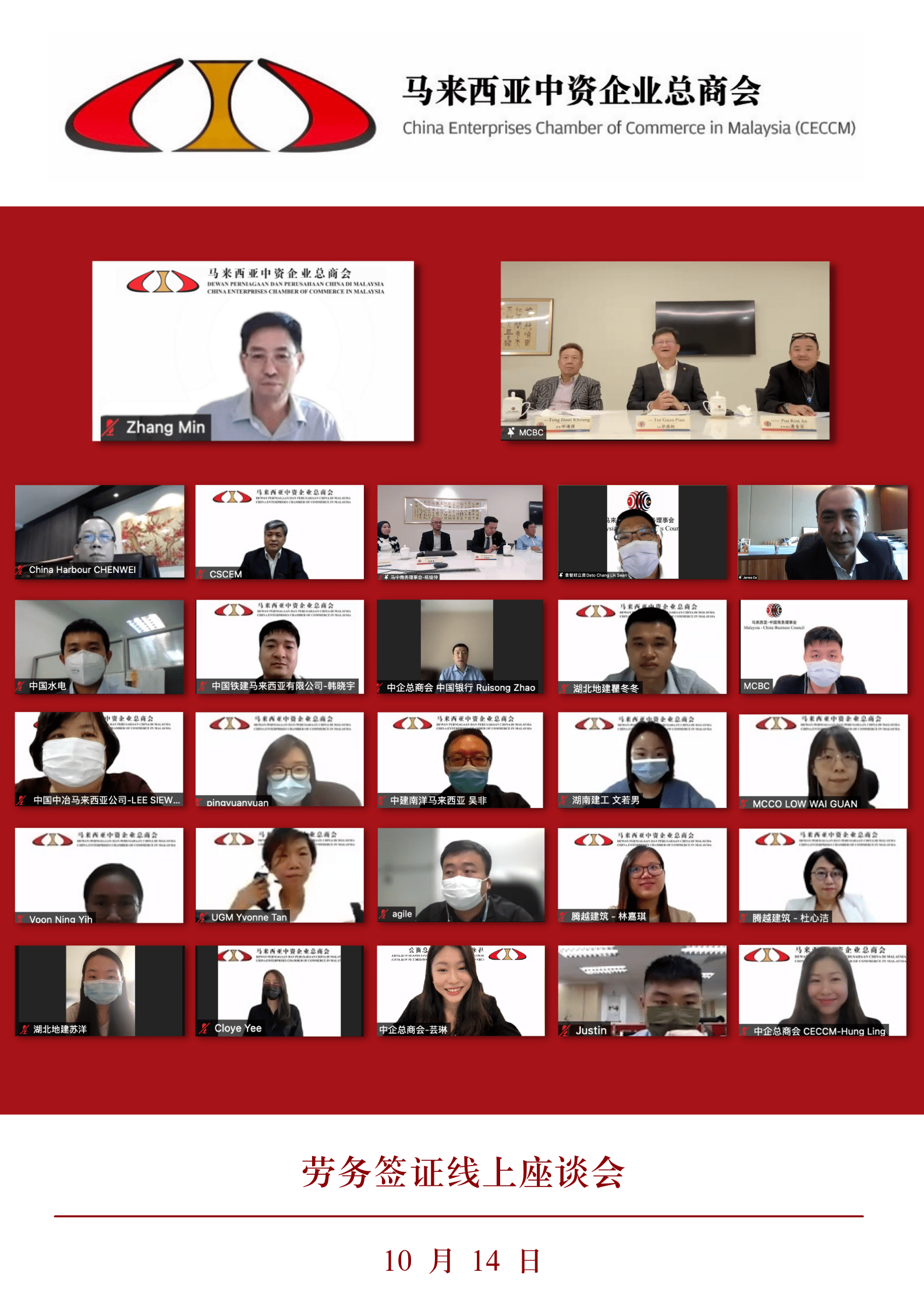 2021年10月14日,马来西亚中资企业总商会与马中签证及商业咨询委员会联合举办“劳务签证主题线上座谈会”。本次线上座谈会由中资企业总商会张敏会长带领十九家中资企业单位代表和马中签证及商业咨询委员会主席拿督郑源炳与其八位委员共同参会。