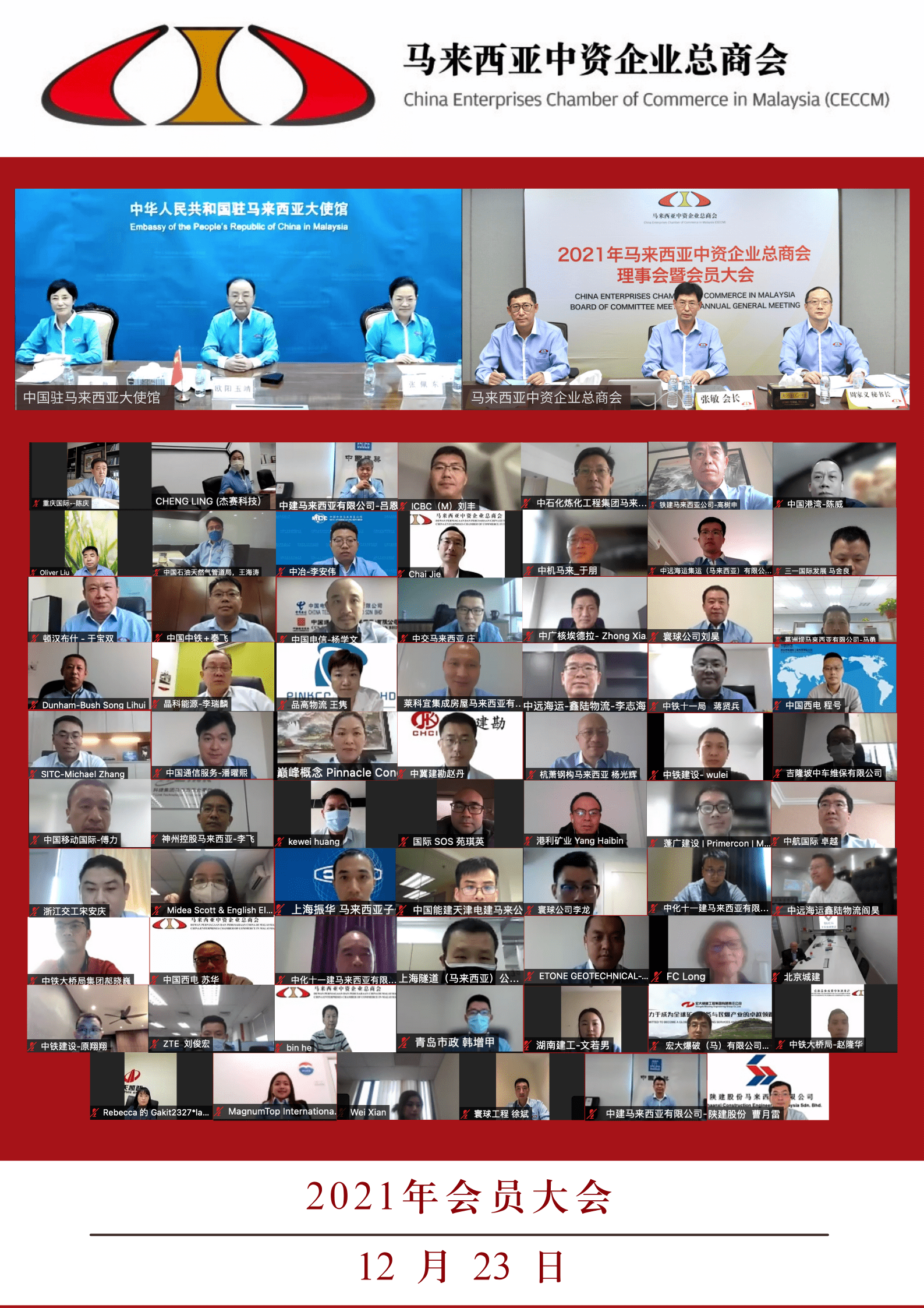 2021年12月23日,马来西亚中资企业总商会(以下简称:总商会)2021年会员大会顺利召开。会议由周家义秘书长主持,中国驻马来西亚特命全权大使欧阳玉靖阁下与经商处张佩东公参及总商会两百余人共聚一堂,通过线上会议的形式参与了会议。