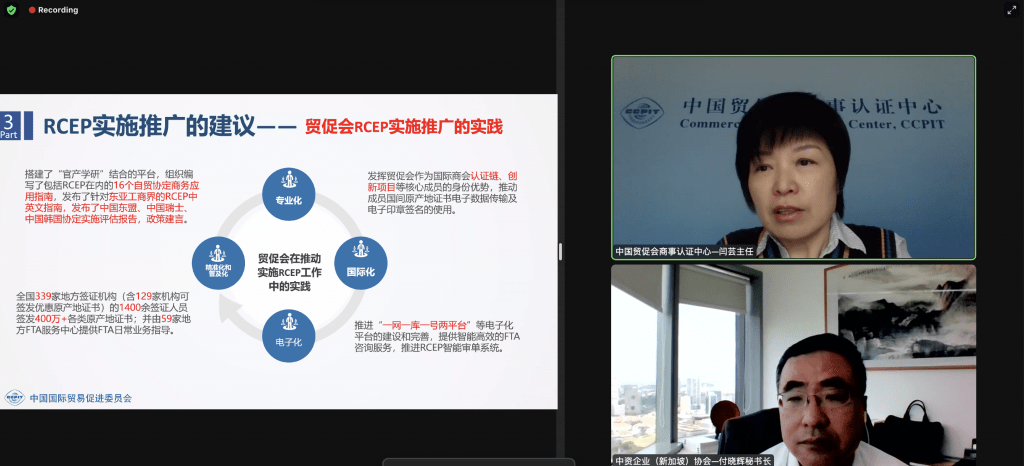 On 28 March 2022, China Enterprises Chamber of Commerce in Malaysia (CECCM) and the China Enterprises Association (Singapore) together with Chinese Enterprises Association in Brunei, Chinese Chamber of Commerce in Cambodia, China Chamber of Commerce in Indonesia Chinese Chamber of Commerce, Laos Chinese Chamber of Commerce, China Enterprises Chamber of Commerce in Myanmar, Chinese Enterprise (Philippines) Association and Chinese-Thai Enterprises Association jointly organized the first RCEP training seminar for Chinese-funded enterprises in Southeast Asia. Yan Yun, Deputy Director-General of CCPIT Commercial Certification Center, was invited as the keynote speaker. A total of 390 participants from Chinese-funded enterprises in Southeast Asian countries attended the webinar virtually.