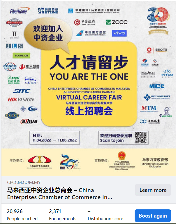 The virtual career fair was well-received and fully supported by the Ministry of Education of Malaysia and the Chinese Embassy in Malaysia. It has so far received more than 20,000 visitor views.
