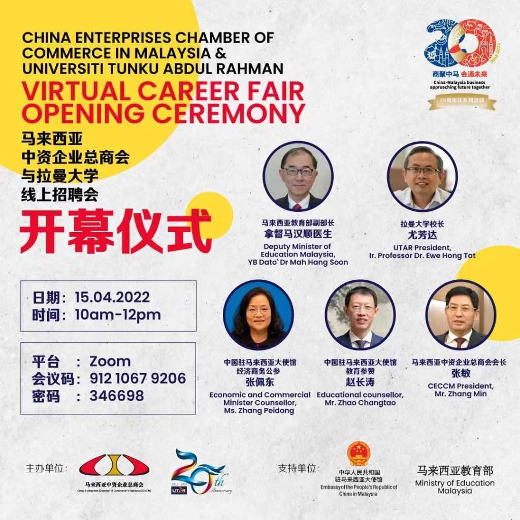On 15th April 2022, the “CECCM x UTAR Virtual Career Fair” jointly organised by the China Enterprises Chamber of Commerce in Malaysia (CECCM) and the Universiti Tunku Abdul Rahman was successfully held. Deputy Minister of Education Malaysia, YB Dato’ Dr. Mah Hang Shun, Economic and Commercial Minister Counsellor of the China Embassy in Malaysia Mdm. Zhang Peidong, Education Counselor of the China Embassy in Malaysia, Mr. Zhao Changtao, President of the CECCM, Mr. Zhang Min, UTAR President, Ir. Professor Dr. Ewe Hong Tat, and the First Secretary of the Economic and Commercial Office of the China Embassy in Malaysia, Mr. Zang Wenbo, members of CECCM, members from the Academic Affairs Office of UTAR attended the virtual opening ceremony. A total of 30 Chinese-funded enterprises participated in the career fair and nearly 700 jobs were opened for the recruitment of local talents in Malaysia. The virtual career fair will last from April to June, where a two-month recruitment platform is established for job seekers to seek jobs.