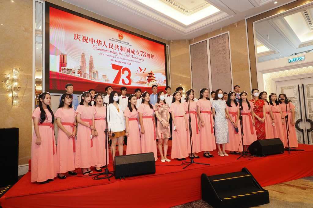 总商会代表与使馆人员及马来西亚芙蓉中华合唱团演唱“歌唱祖国”。