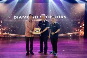 张敏会长(左一)接收马来西亚中华总商会总会长及登中总会长丹斯里卢成全(中)赠送的纪念品,由登中总署理会长颜林茂先生(右一)见证。